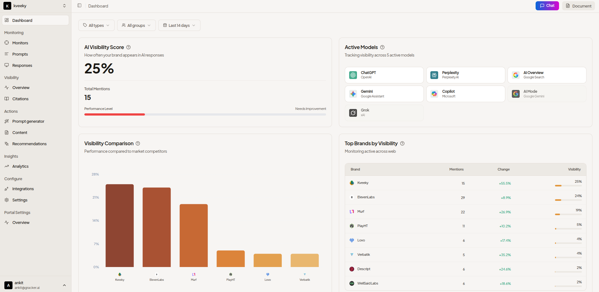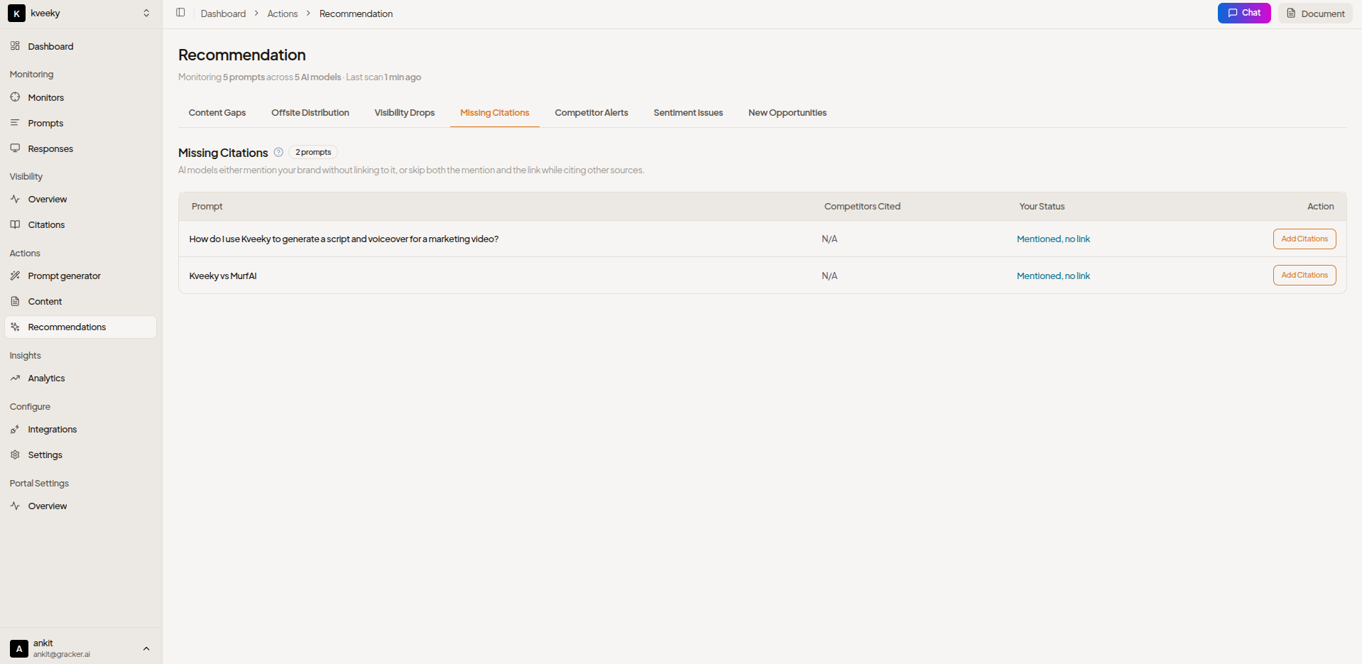 1. Actionability: Does the tool tell you what to do about visibility gaps, or just report them? GrackerAI's Recommendation Engine gives you a prioritized action list of content gaps, missing citations, and competitor alerts.