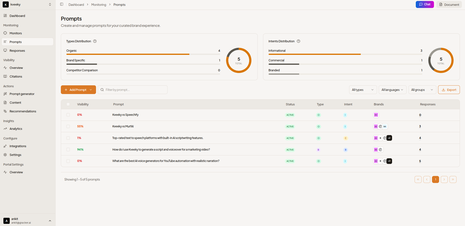 Monitor exactly which buyer prompts mention your brand versus competitors. You get visibility percentages broken down by commercial, informational, and branded queries across every AI model. No sampling. No estimates. Exact data on where you appear and where you don't.