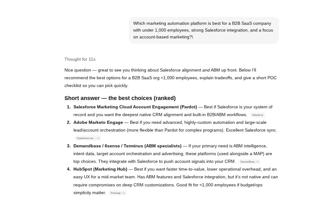 "Which marketing automation platform is best for a B2B SaaS company with under 1,000 employees, strong Salesforce integration, and a focus on account-based marketing?"